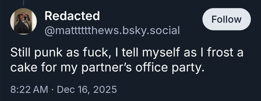 Alt: Screenshot of bluesky post that says "Still punk as fuck, I tell myself as I frost a cake for my partner’s office party. "