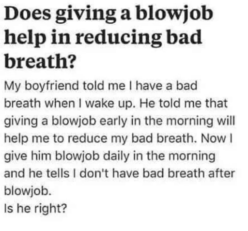 He’s absolutely correct. Giving a BJ gets saliva and oxygen flowing. Morning breath is from your mouth “sitting still” all night, closed and dry.